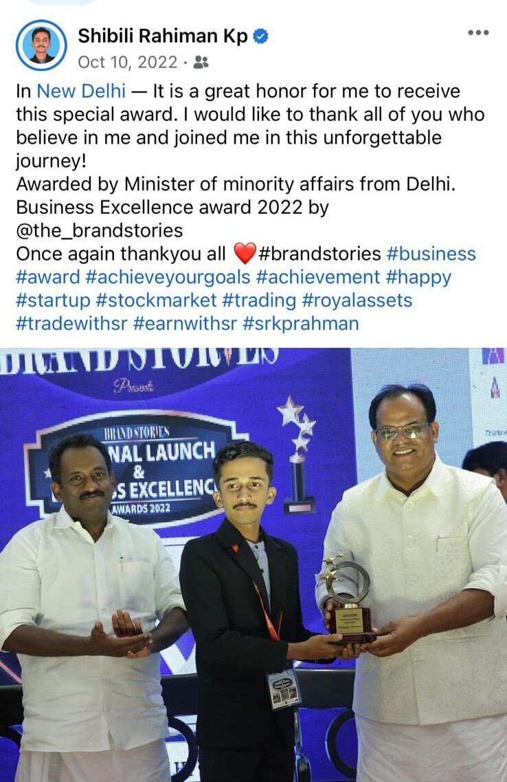 Shibili’s journey began as an office boy at the age of 12, and within a decade, he transformed into a recognized business tycoon featured in international magazines, invited as a chief guest at institutions, and celebrated as one of Kerala’s leading young entrepreneurs. His work has inspired thousands through training programs, mentorship, and social media influence, where he shares insights on entrepreneurship, personal finance, and startup growth.